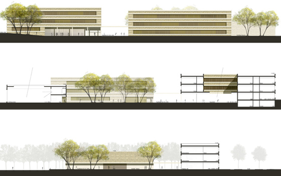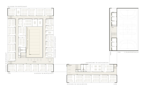 Die Schule wird über den südlichen Haupteingang erschlossen. Die zentrale und von oben belichtete Pausenhalle ist das Herz der BOS. Der Speisesaal kann über eine flexible Trennwand mit der Pausenhalle für Veranstaltungszwecke verbunden werden. Im erhöhten Erdgeschossbereich sind die Verwaltung, das Lehrerzimmer und die Bibliothek untergebracht. Die Klassen- und Fachräume für Wirtschaft befinden sich im 1. Obergeschoss, die Unterrichts- und Fachräume für Technik im 2. Obergeschoss. Die funktionale Gliederung drückt sich in den Fassaden aus. Der dreigeschossige Erweiterungsbau des II.BA ist das bauliche Bindeglied zwischen dem Hauptschulbaukörper und der Sporthalle. Er ist über alle Etagen zweibündig und sehr wirtschaftlich organisiert. Am östlichen Ende ist eine Flurerweiterung für den interdisziplinären Austausch und visuellem Kontakt in den Schulhof geplant. Die Sporthalle schließt den Schulhof nach Osten hin ab.