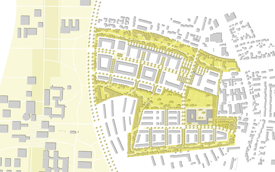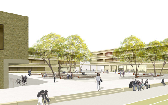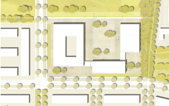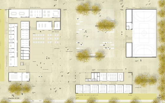 Die BOS besteht aus 3 Baukörpern: Dem Gebäude des I.BA FB Wirtschaft und Technik, dem geplanten II.BA FB Soziales und der Zweifeldsporthalle. Der 3-seitig gefasste, quadratische Schulhof öffnet sich zu den Freisportanlagen mit einem schönen Blick über die Stadt. Durch die leicht versetzt zueinander stehenden, rechtwinklichen Bauten bilden sich vor den jeweiligen Eingängen kleine Plätze mit hoher Aufenthaltsqualität. Die Bushaltestelle befindet sich direkt vor dem Haupteingang der Schule. Die Baukörper nehmen die vorhandene Topografie auf. Durch einen Niveausprung innerhalb des Hauptbaukörpers erhalten die Pausenhalle und der Speisesaal eine maximierte Geschosshöhe, die den geforderten Raumgrößen angemessen ist. Die Eingänge der Gebäude sind über filigrane Pergolen miteinander verbunden. Der zentrale Schulhof wird durch die Baulichkeiten klar definiert und begrenzt.