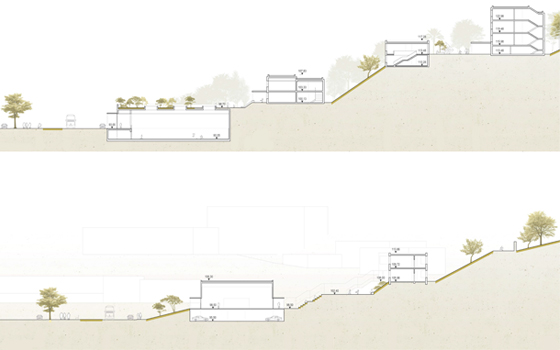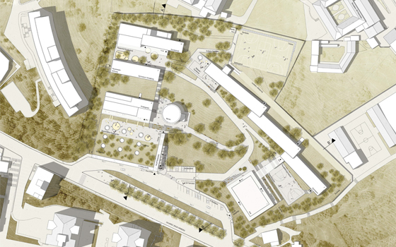 Die deutsche Schule Bilbao wurde ursprünglich in ländlich geprägter Stadtrandlage errichtet. Heute ist sie umgeben von mehrgeschossigen Wohnbebauungen sowie weiteren Schulen und bildet mit ihren weitläufigen Freiflächen hierzu einen wohltuenden Kontrast. Das Grundstück ist charakterisiert durch einen großen Höhenunterschied an dem sich die sieben bestehenden Schulgebäude harmonisch in einer Staffelung hangaufwärts anordnen. Der neu organisierte Vorbereich der Deutschen Schule formuliert die neue Adresse des Schulcampus. Das Gebäude der Sporthalle öffnet sich dabei zur Stadt und übernimmt die Funktion eines Eingangsgebäudes des Campus. Die bestehende Vorfahrt wird weitestgehend angehoben und dem Niveauverlauf der Avenida Jesùs Galindez angeglichen. Dadurch wird eine großzügigere Vorplatzsituation geschaffen und der Campus auf das Niveau der Stadt gehoben. Dies ist nicht nur zur Entspannung der Verkehrssituation nötig, sondern unterstreicht gleichzeitig das gewachsene Selbstverständnis, als Teil der Stadt Bilbao. Der Baukörper Sporthalle und die Erweiterung des Gymnasiums orientiert sich sowohl an seinem Abschluss im Westen, als auch im Osten an der Staffelung der Bestandsgebäude nach Norden. Auf eine signifikante Höhenentwicklung der Neubauten wurde bewusst verzichtet. Daher ist die Sporthalle in den Hang eingeschoben und befindet sich im Untergeschoss auf dem Niveau der ehemaligen Erschließung. Der Erweiterungsbau des Gymnasiums ist zweigeschossig ausgebildet. Alle Neubauten gliedern sich damit in die bestehende Staffelung der Bestandsgebäude ein. Der bestehende Sportplatz wird optimiert und neu erschlossen. Nach Fertigstellung der Sporthalle und aller ergänzenden Baumaßnahmen wird die bestehende Aula und Einfeldsporthalle durch den Neubau der neuen Aula ersetzt. Dieser rückt ebenfalls näher an die Stadt und verstärkt durch seine Ausformulierung die Adressbildung der Schule. Die beiden flankierenden Bauten - Sporthalle und Aula - stärken die herausragende Qualität der „Grünen Mitte“