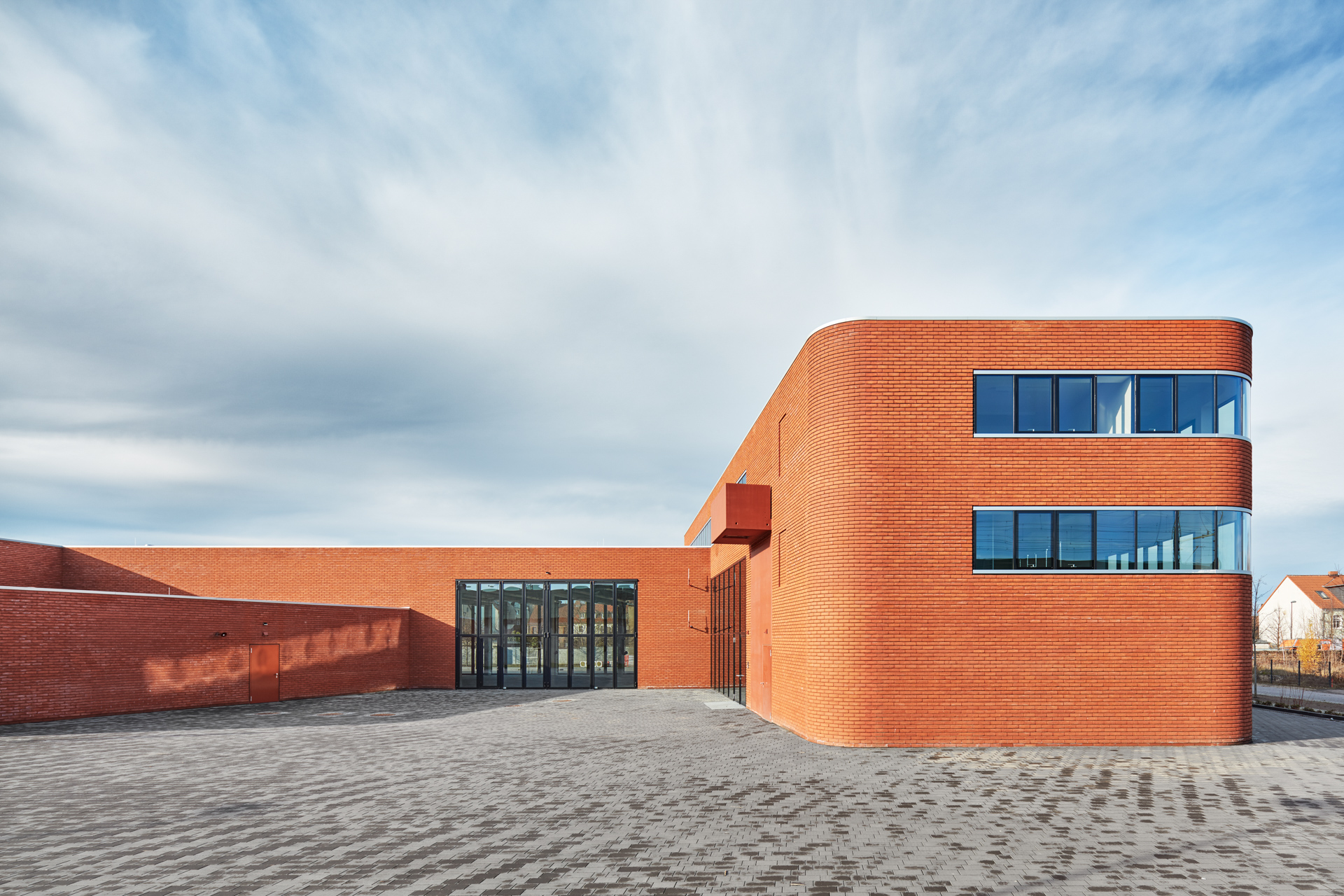 Der Neubau der Feuerwehr Luckenwalde ordnet sich in die städtebauliche Typologie der nordwestlichen Solitärbebauung entlang des Bahndamms ein. Das Gebäude steht parallel zur Dessauer Straße zentral auf dem Grundstück. Die verschiedenen Nutzungsbereiche sind baukörperlich nach außen ablesbar und für den Betrachter verständlich. Durch die unterschiedlich hohen Gebäudeteile und Ausrichtungen entsteht eine spannende und architektonisch abwechslungsreiche Komposition. Die fließende Formensprache mit den leichten Rundungen an den Außenecken und das durchgehende homogene Fassadenmaterial halten die einzelnen Bereiche zusammen. Durch eine deutliche Bauteilzäsur entlang des Bahndamms entsteht ein gefasster und konisch ausgerichteter Feuerwehrhof. Die Fassade besteht aus umlaufenden Bändern einer hellroten Ziegelvorsatzschale auf einer Edelstahl-UK, die mit hellen eloxierten Aluminiumprofilen bündig eingefasst sind.