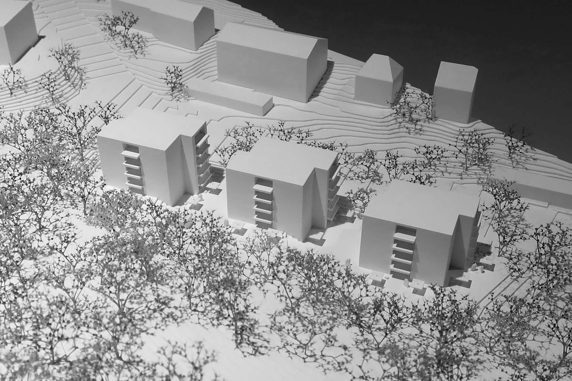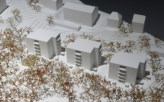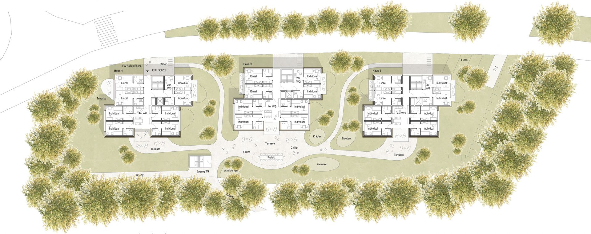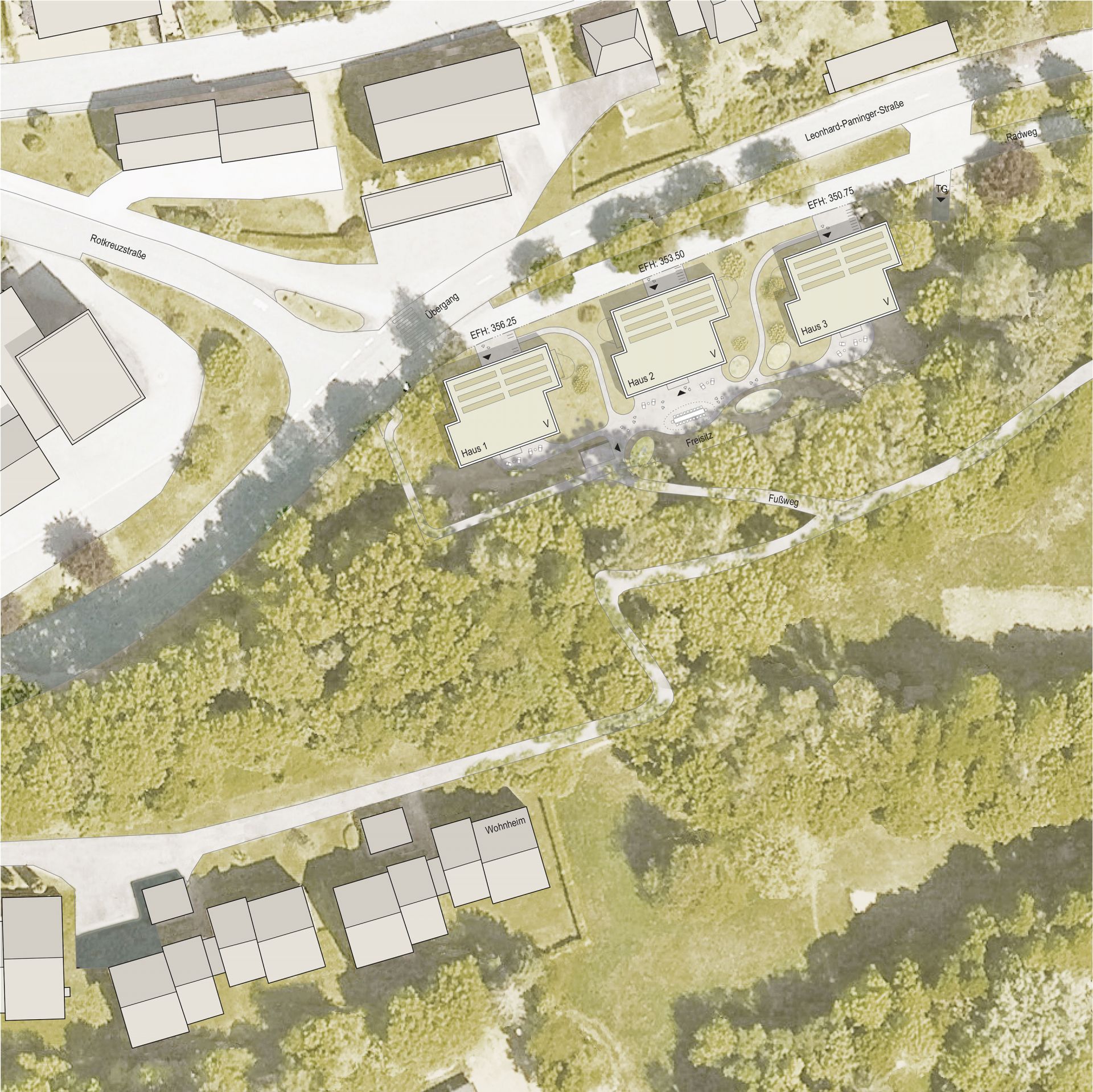 Das schmale Baugrundstück für die Studentenwohnungen an der Leonhard-Paminger-Straße fällt deutlich von Südwesten nach Nordosten und wird durch den südlich angrenzenden Mischwald geprägt. Um möglichst differenziert auf die vorhandenen topografischen Gegebenheiten und die Anbindungen an die öffentlichen Wege reagieren zu können, wird ein Dreiklang aus 5-geschossigen, holzverkleideten Studentenhäusern vorgeschlagen. Sie sind bis auf die Erdgeschosszone baugleich aufgeteilt. Die Baukörper sind in ihrer Längsachse einmal geteilt. Dadurch wird das zur Verfügung stehende Baugrundstück optimal ausgenutzt. Die Ablesbarkeit der verschiedenen Einheiten wird ermöglicht und die Außenräume zwischen den Häusern werden spannungsvoller und vielfältiger. Alle 3 Häuser erhalten einen großzügigen Zugangsbereich mit Fahrradabstellmöglichkeiten von der Straße aus. Ein sanft geschwungenes Wegegeflecht verbindet die vor den Allgemeinräumen angeordneten Freibereiche miteinander. Im Erdgeschoss des zentralen Hauses befinden sich der großzügige Gemeinschafts- und Mehrzweckraum mit einer vorgelagerten Terrasse. Die Studentenwohnhäuser sind mit einer zum Teil 2-geschossigen Tiefgarage unterirdisch miteinander verbunden.