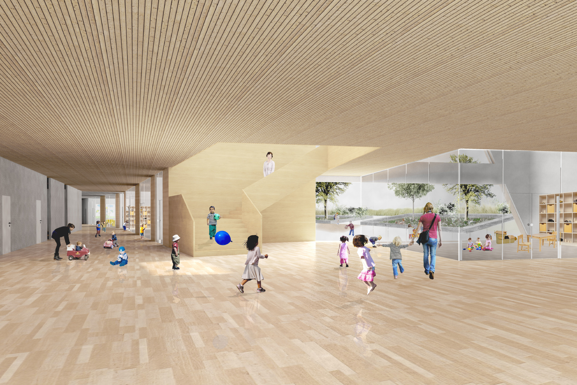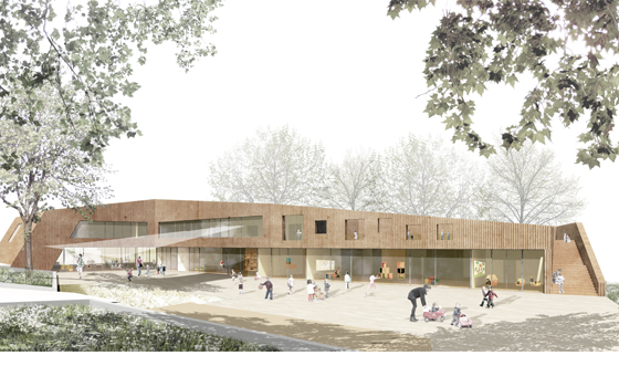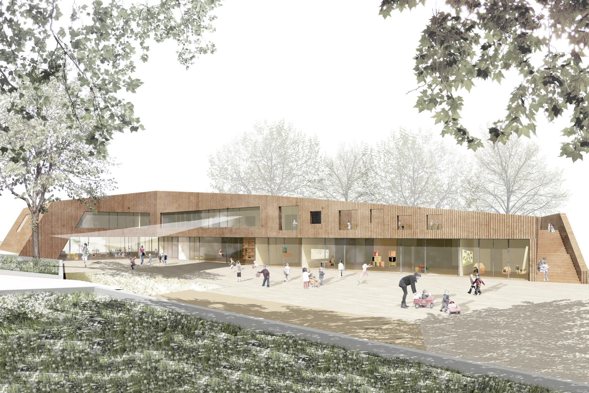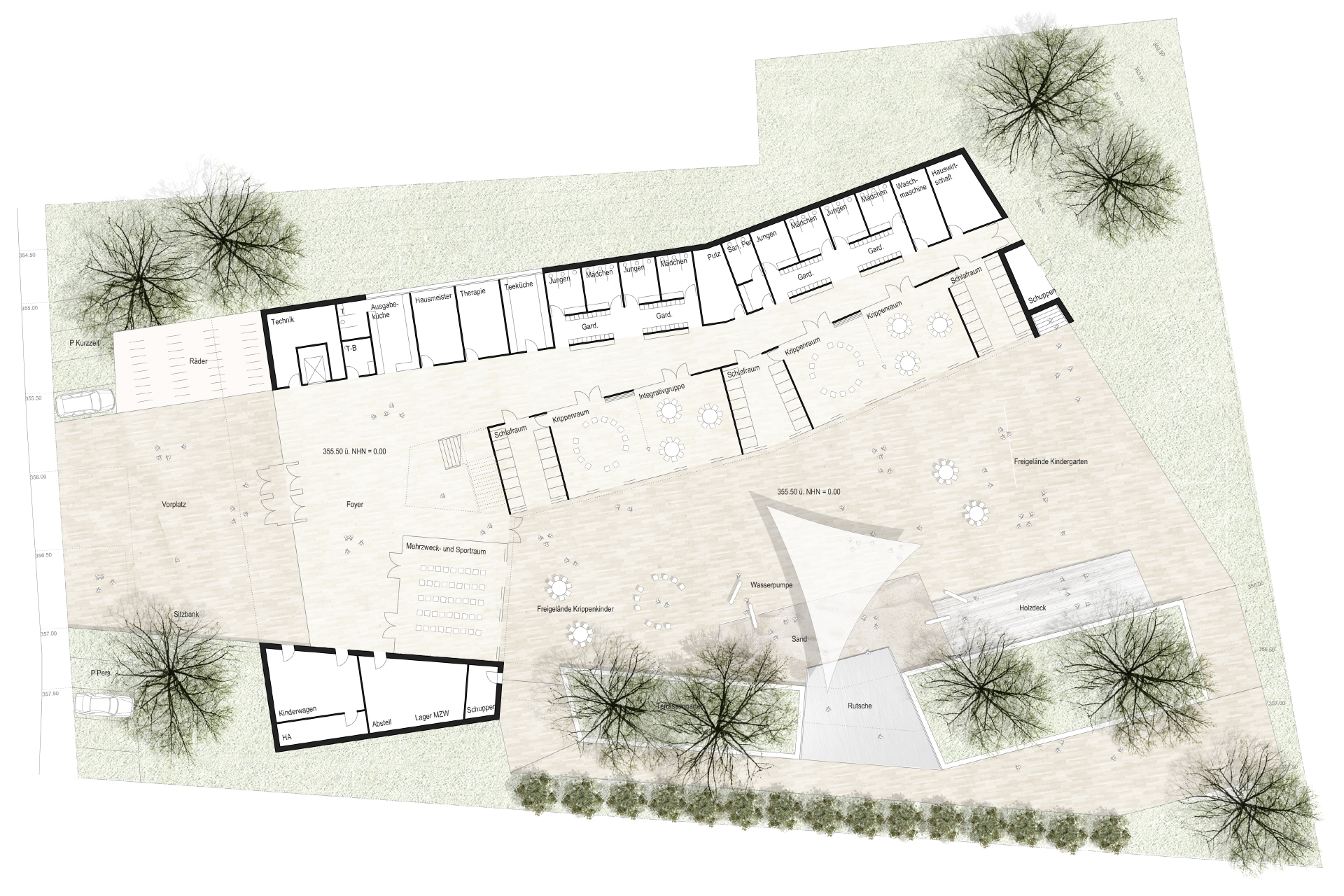 Der 2-geschossige, gefaltete Baukörper lagert sich an die nördliche Grundstückgrenze an und erzeugt mit der kurzen Seite einen gut dimensionierten, einladenden Vorplatz vor dem Haupteingang. Die lange Gebäudeseite knickt am Übergang zur Sonnenterrasse ab, nutzt damit das Grundstück besser aus und öffnet sich deutlich nach Süden. Der größte Grundstücksbereich bleibt unbebaut und dem Spiel im Freien vorbehalten. Die vorhandene Topografie bietet reichhaltige Möglichkeiten, den Garten auf mehreren Ebenen zu unterteilen und diese mit Rutschen, Rampen, Kletterwegen und Wasserspielen zu verbinden. Große Bäume spenden im Sommer Schatten. Hecken entlang der Grundstückgrenze schirmen den Freibereich von den angrenzenden, gewerblich genutzten Grundstücken ab. Vor dem großzügig überdachten Haupteingang befindet sich ein Vorplatz mit einer Sitzbank zum Warten. Das zentrale Foyer ist hell und einladend. Die Haupttreppe führt direkt zu den Kindergartengruppen im Obergeschoss. Der Großteil der dienenden Räume ist in einer schmalen Raumspange entlang der nordöstlichen Grundstückgrenze organisiert. Alle Gruppen- und Schlafräume sind zum geschützten Freibereich nach Süden ausgerichtet und lassen sich zum Freigelände hin öffnen. Gerade in den Übergangs- und Sommermonaten ist der Bezug zum Hof sehr wichtig. Der gesamte Freibereich lässt sich von den Krippenräumen einsehen. Dies erleichtert die Aufsichtspflicht. Die Kinder im Obergeschoss erhalten eine großzügig dimensionierte Spiel- und Frühstücksterrasse, die über eine einläufige Treppe mit dem Garten verbunden ist.