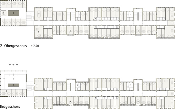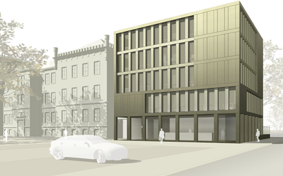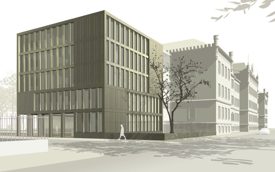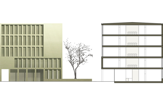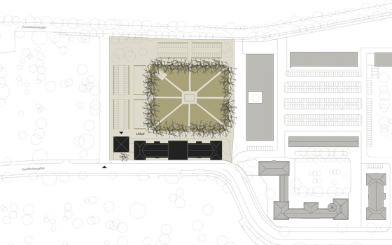 Das Landesamt für Straßenbau und Verkehr erhält einen neuen prägnanten fünfgeschossigen Eingangswürfel, der das Image einer modernen und innovativen Behörde stärkt. Der Grundgedanke des Entwurfs besteht darin, dem Denkmal einen eigenständigen und selbstbewussten Neubau gegenüber zu setzen, der den Standort an der Stauffenbergallee durch eine spannungsvolle architektonische Auseinandersetzung von Alt | Neu aufwertet. Der denkmalgeschützte Altbau bleibt bis auf den Übergang zum Neubau unangetastet. Der Kubus nimmt sich etwas zurück und rückt von der Straßenflucht ab. Wie alle übrigen Gebäude der ehemaligen Kasernenbauten entlang der Stauffenbergallee wird auch das neue LASuV hofseitig erschlossen. Nördlich der denkmalgeschützten Grünanlage und entlang der östlichen Grundstückgrenze sind die Parkplätze angeordnet. Die Stellplätze vor dem Eingang sind den 41 Dienstfahrzeugen vorbehalten. Der Haupteingang wird durch einen Gebäuderücksprung im Erdgeschoss definiert. Die Fußgänger gelangen über die Erschließungsstraße direkt in das Foyer.