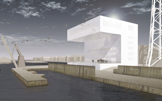 Die kraftvolle Gebäudegestalt bezieht sich mit seiner glänzend weißen Keramikfassade auf die Farben von Meeresgischt und Himmel.
