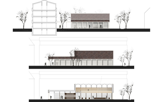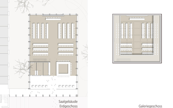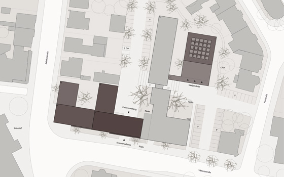 Der Neubau der Kreisverwaltung nimmt die südliche Gebäudeflucht des Alten Kreishauses auf und setzt diese in Richtung Westen fort. Durch Gebäuderücksprünge wird der lange Baukörper gegliedert und proportioniert. Die Gebäudeabschnitte nehmen in ihrer Größe Bezug auf die Bestandsgebäude der Viktoriastraße. Ein markanter fünfgeschossiger Gebäudeteil mit dem neuen Haupteingang schließt fugenlos an den Altbau an. Durch die Staffelung der Geschosse auf 4 Geschosse entlang der Viktoriastraße und auf 3 Geschosse entlang der Bahnhofstraße wird auf die niedrigere Anschlussbebauung reagiert. Die Baufluchten des Baufeldes entlang der Bahnhofstraße mit den typischen Vorder- und Hinterhäusern werden im Neubau aufgenommen und weitergeführt. Die geordnete und klar gegliederte Hofstruktur schafft eine räumlich gefasste Zugänglichkeit vom nördlich gelegenen Parkplatz aus. Das zentrale Eingangsfoyer im Neubau ist von der Viktoriastraße aus und vom dahinter liegenden Parkplatz erreichbar. Die Pflanzbeete vor dem Alten Kreishaus kommen auch im Bereich des Neubaus zum Einsatz. Diese schaffen die notwendige räumliche Distanz der Büroräume zu dem vorgelagerten öffentlichen Gehweg. Der teilbare Kreistagssaal mit den dazugehörigen Nebenräumen ist als Sonderbau mit einer überdachten Anbindung an den Büroriegel im Zentrum der Liegenschaft situiert. Vor dem Eingang befinden sich eine freie Platzfläche und die notwendigen PKW-Stellplätze. Der von oben belichtete quadratische Saal ist durch eine Überhöhung baukörperlich ablesbar. Durch die niedrige Gebäudehöhe und den gebührenden Abstand zum Verwaltungsriegel werden die bestehenden Büroräume nicht beeinträchtigt. Ein Parkweg führt um den neuen Saal herum und verbindet die Freibereiche der Liegenschaft untereinander.