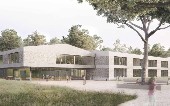 Das Grundstück „Am Bullenberg“ für die neue Grundschule liegt an der mit Alleebäumen gefassten Chausseestraße. Es steigt deutlich nach Süden hin an und wird am Ende durch eine Waldkante gefasst. Die umgebende Bebauung ist locker verteilt und max. 2 geschossig hoch. Insgesamt ist das Hanggrundstück am Ortsrand von Königs Wusterhausen durch seinen natürlichen und grünen Charakter geprägt.