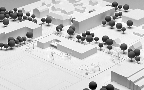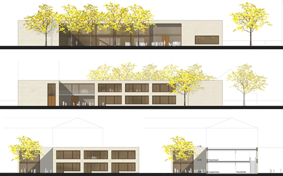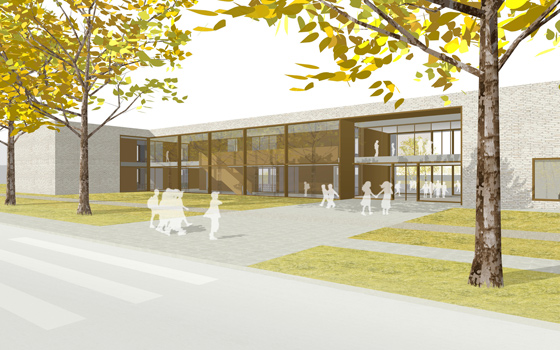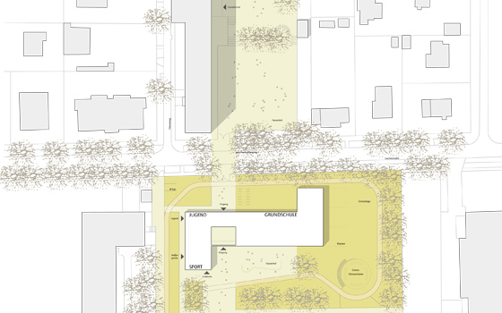 Der zweigeschossige Neubau stellt deutliche Bezüge zur nördlich gelegenen Schule und zum Sportgelände her. Die baulich gefassten Bereiche haben eine hohe Aufenthaltsqualität. Dort befinden sich auch die Zugänge in das Gebäude. Ein markantes Entwurfselement ist die Erschließungsachse, die die Schule und die Sporthalle mit dem Neubau verbindet. Über diese eindeutige Wegeverbindung werden alle Funktionen auf sehr einfache und übersichtliche Art und Weise zusammengeführt. Ein Fußweg gewährleistet das sichere Überqueren der Straße. Die Eingangsseite des Neubaus ist großzügig verglast.
