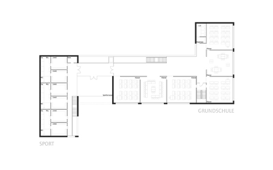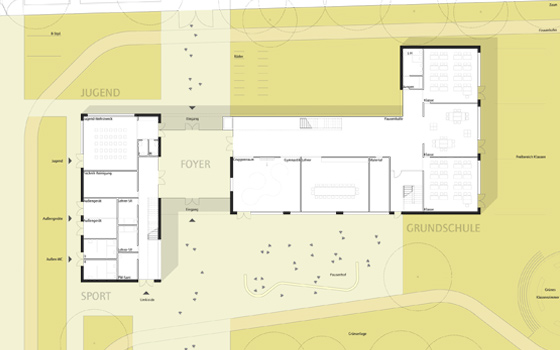 Das zentrale Foyer ist das Bindeglied zwischen dem Sport und dem schulischen Bereich. Die einzelnen Funktionen können autark voneinander genutzt werden. Der Sportfunktionsbereich und der Jugendraum besitzen separate Eingänge. Die Umkleideräume im Obergeschoss sind über eine einläufige Treppe direkt an den Ausgang zum Freisportgelände angebunden. Die Räumlichkeiten der Schule werden über das zentrale Foyer erschlossen. Im EG und OG ist vor den Klassenräumen ein großzügiger Flurbereich angeordnet, der bei schlechtem Wetter als Pausenaufenthalt dient. Die Flurzonen sind über eine einläufige Treppe miteinander verbunden. Sämtliche Klassenräume sind über Schallschutztüren miteinander verbunden. Die Räume im Erdgeschosse haben Außentüren und öffnen sich zum angrenzenden Freibereich. Im Obergeschoss wird den Schülern zusätzlich eine Spielterrasse angeboten. Der teilbare Gruppen– und Gymnastikraum befindet sich in unmittelbarer Nähe zum Eingang.