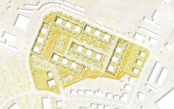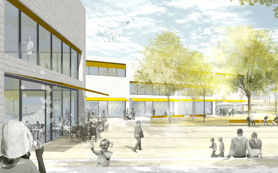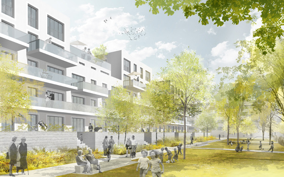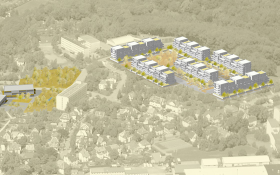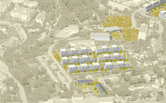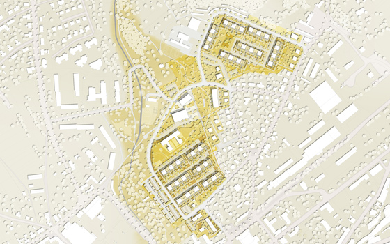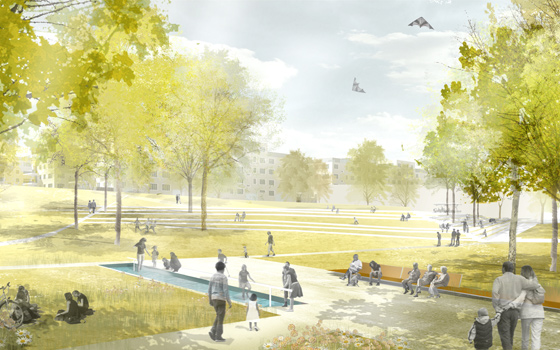 Das Wettbewerbsgrundstück grenzt im Norden und im Westen an ein großes zusammenhängendes Waldgebiet, das bis an die nahegelegene Talsperre reicht. Der Weg dorthin führt entlang des Stadtbaches in einem kleinen Tal. Die Idee ist, diese vorhandene freiräumliche Qualität aufzunehmen und bis in die Mitte des Wohnbaugebiets hinein fortzusetzen. Über eine schöne Parklandschaft wird die Stadt mit dem Naherholungsgebiet verbunden. Die städtebauliche Mitte bildet somit eine großzügige Grünfläche, die mit reizvollen Aufenthaltsflächen, Spazierwegen, Spielgeräten und einem Kneipp Wassertretbad aufgewertet wird. Alle öffentlichen Einrichtungen wie das Jugend-Freizeitzentrum, die Kita Sonnenschein, das Multikulturelle Begegnungszentrum und das Bowlingzentrum mit ihren Freianlagen werden in den Grünzug integriert. Die ehemalige Kaufhalle wird durch einen wohlproportionierten, funktionalen Neubau entlang der Straße der DSF ersetzt. Durch die neue Gebäudekonfiguration entstehen geschützte Freibereiche, die sich nach Süden orientieren und eine hohe Aufenthaltsqualität im Freien garantieren. Sitzstufen vermitteln zwischen den unterschiedlichen Niveaus des bewegten Geländes. Dafür werden die Betonplatten verwendet, die durch den Rückbau der Plattenbaugebiete anfallen. Dadurch werden sie einer ökologisch sinnvolle Verwendung zugeführt und teuere Entsorgungskosten eingespart. Die bestehenden Wohngebiete grenzen an die neue Parkfläche.