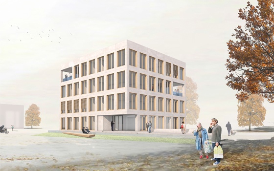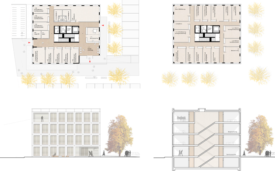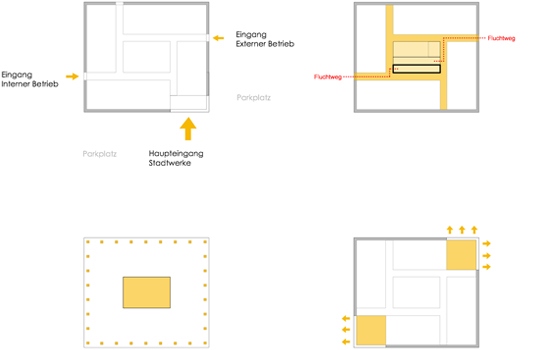 Die Stadtwerke Leinfelden-Echterdingen beabsichtigen am östlichen Stadtrand von Leinfelden-Echterdingen einen Neubau für ihre Verwaltung zu realisieren. Eingebettet zwischen Industriegebiet und Filderlandschaft steht der Neubau in einem spannungsreichen Dialog mit der heterogenen Umgebungsbebauung. Unter Berücksichtigung des stadträumlichen Kontextes gestalten wir den Neubau als kompakten und robusten Solitär. Zum Stadtraum ausgerichtet sieht das Konzept vor, ein klar definiertes Gebäudevolumen zu generieren, welches durch ausgewählte Einschnitte in das Gebäude Außenbezüge schafft. Der Neubau positioniert sich im städtebaulichen Kontext präsent an einer wichtigen Übergangsstelle. Er schafft durch seine komprimierte Grundfläche einen ergänzenden Orientierungspunkt im bestehenden Umfeld. Der Hauptzugang erfolgt von Süden aus über das Foyer, welches als halböffentliche Zone die Stadtwerke und Gäste zum Verweilen und Informieren einlädt. Dieser Bereich schafft eine Pufferzone zwischen öffentlichem und internem Betrieb.
