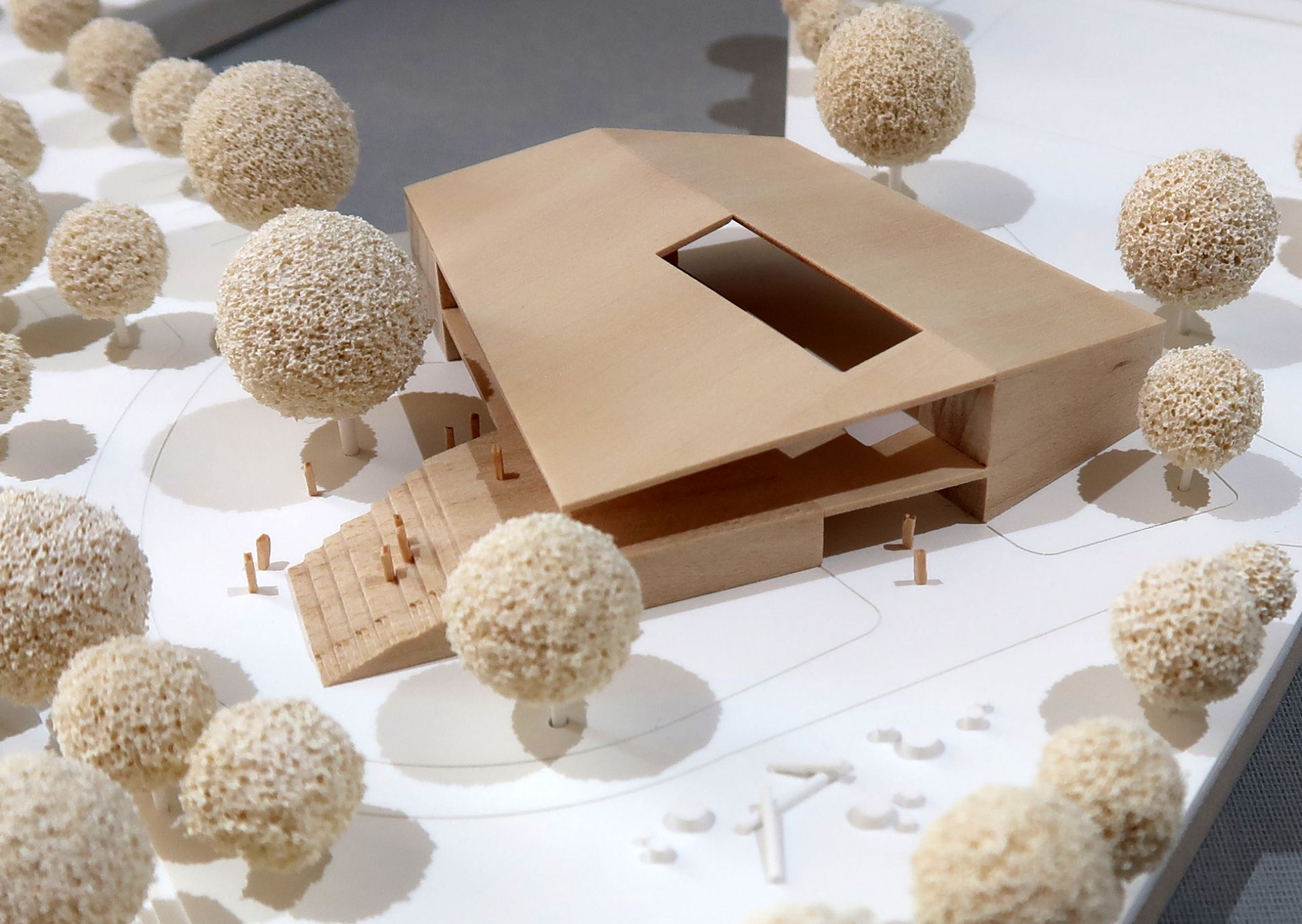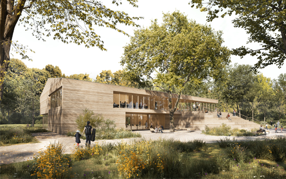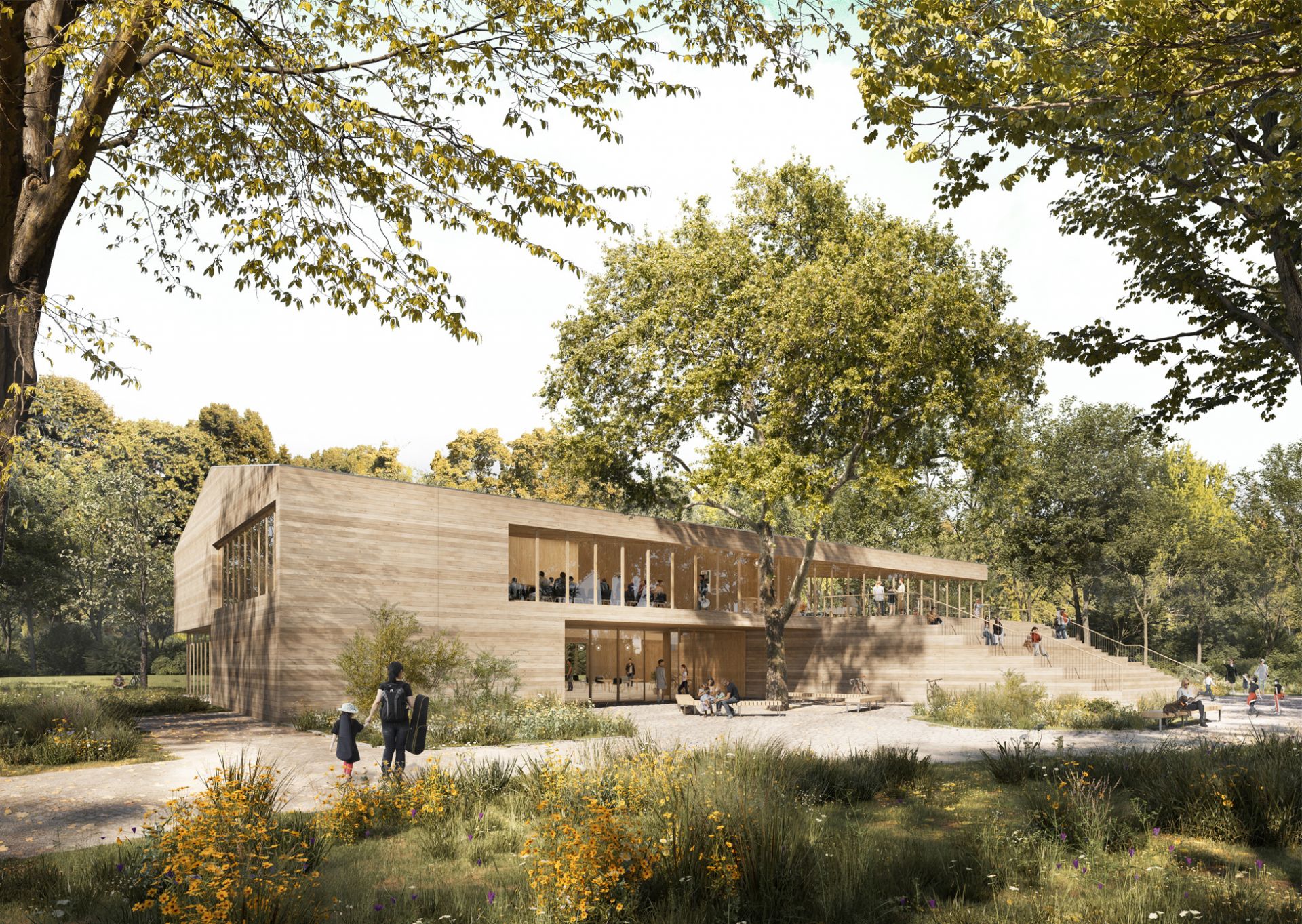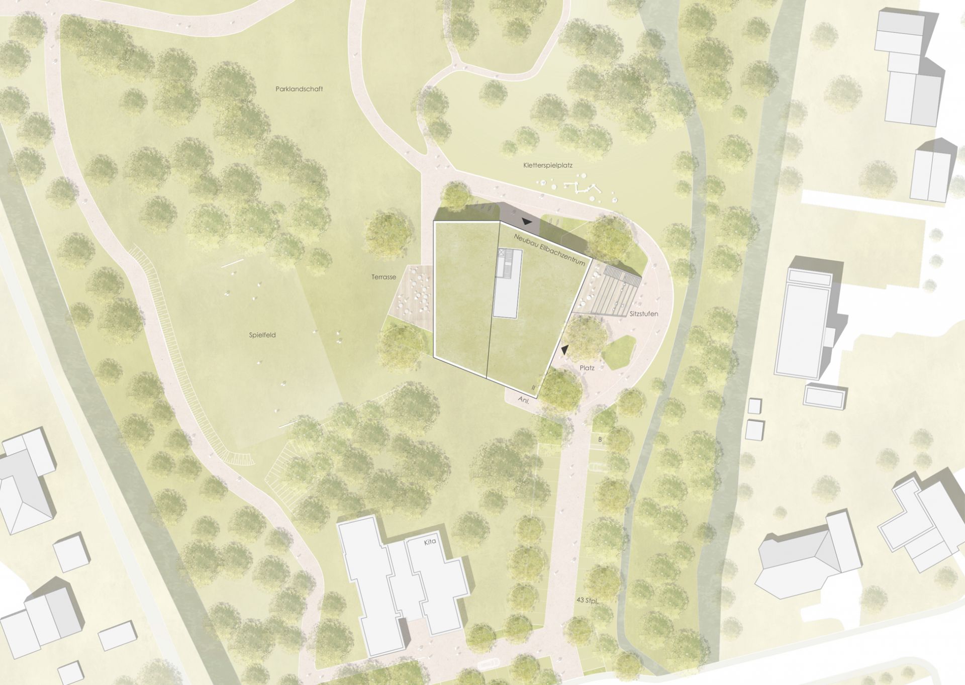 Die zentrale polygonale Gebäudefigur mit Ausrichtung auf mehrere Seiten, fügt sich in die gegebene Parkstruktur mit den angelegten Wegen ein. Das Gebäudeinnere ist mit dem Außenraum durch Gebäuderücksprünge an den Eingängen, einer Sitztreppe und einer Terrasse nach Westen verflochten. Die aus dem Baukörper auskragende Sitztreppe bildet mit dem zentralen Haupteingang einen geschützten und einladenden Vorplatz in Richtung Südosten. Ein weiterer Eingang schließt das Gebäude an den Parkweg nach Norden an. Durch die Gebäudeform, die Materialität der Fassade und das Gründach fügt sich das Gebäude maximal gut in den umgebenden Park ein.
